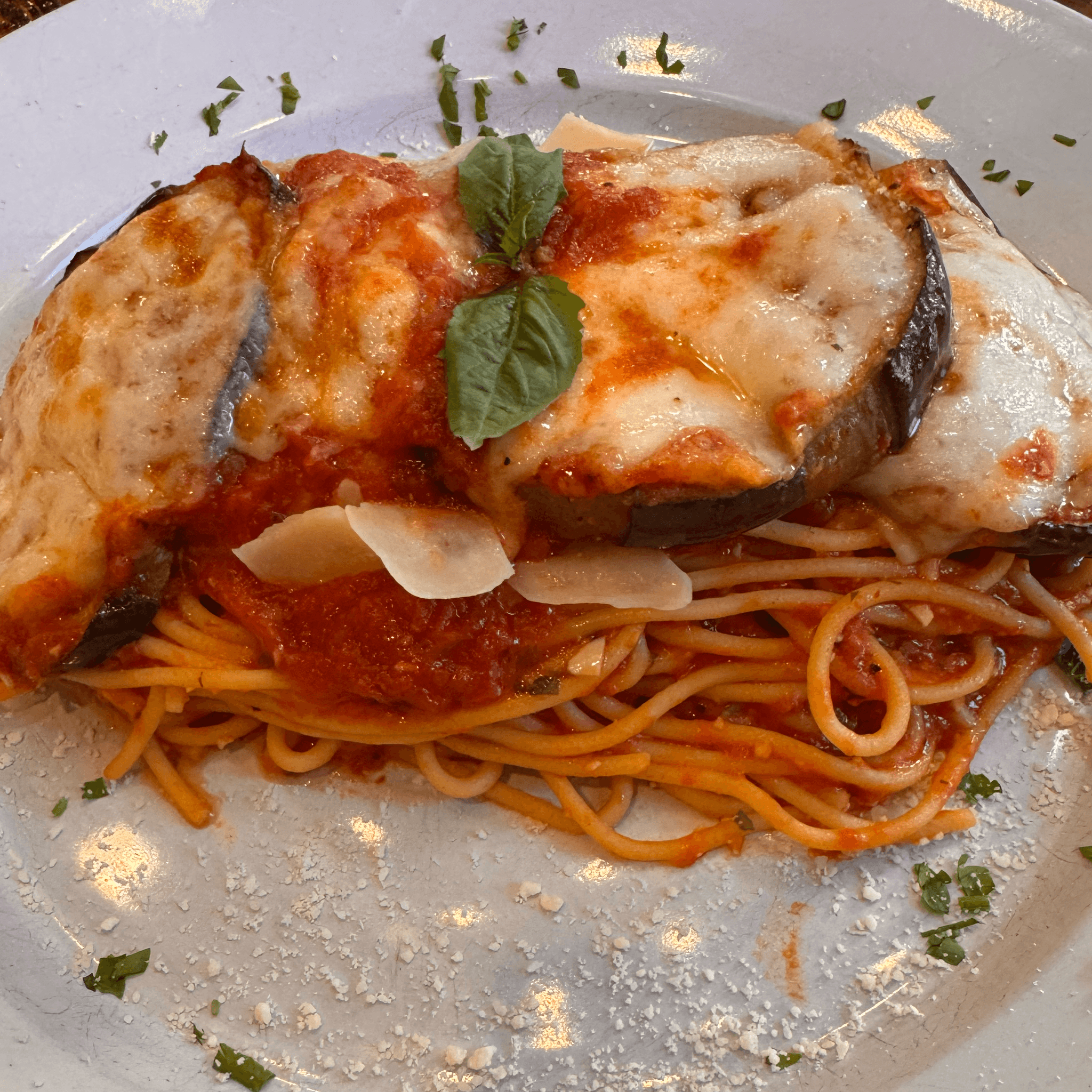 Breaded eggplant, homemade tomato sauce, melted mozzarella, and Parmesan cheese