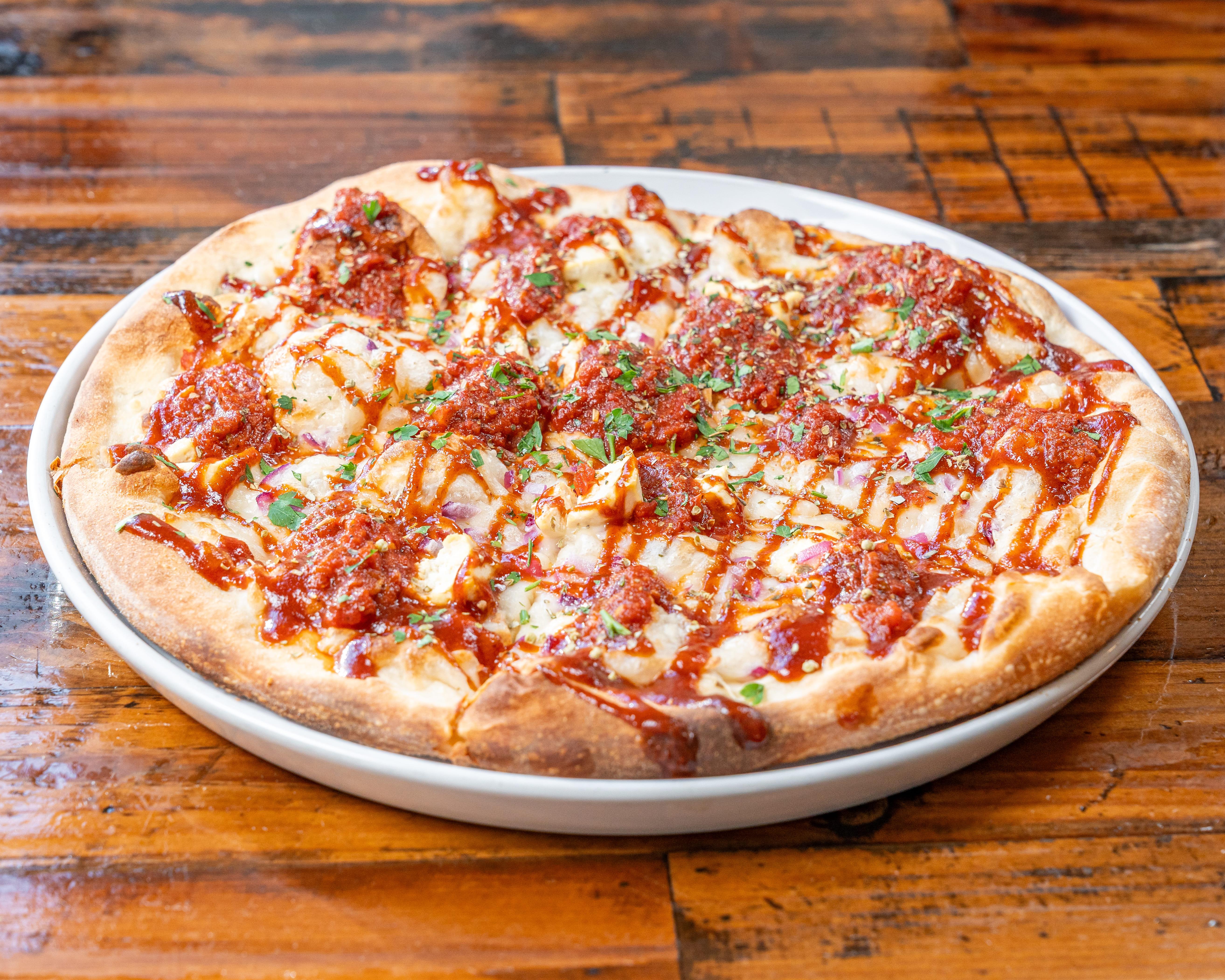 Marinara or BBQ sauce blend, vegan cheese, red onion, roasted BBQ tofu, and fresh basil