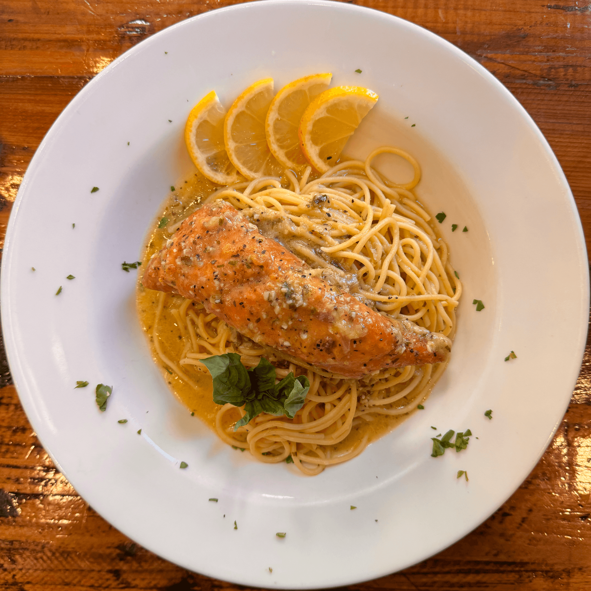 Egg battered, sautéed with lemon herbs, butter, and white wine sauce, served over pasta