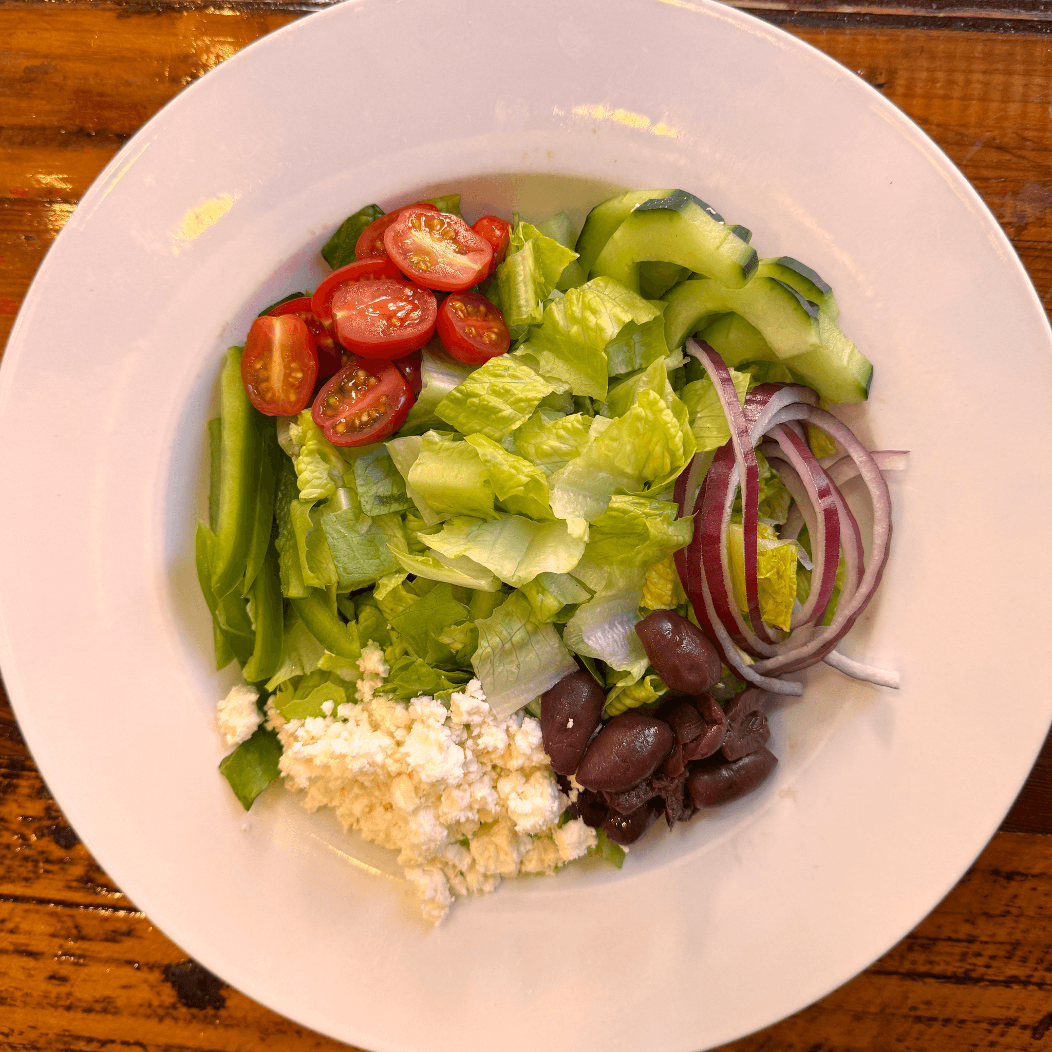 Romaine lettuce, tomato, onions, cucumbers, Kalamata olives, green peppers, and feta cheese with Greek dressing