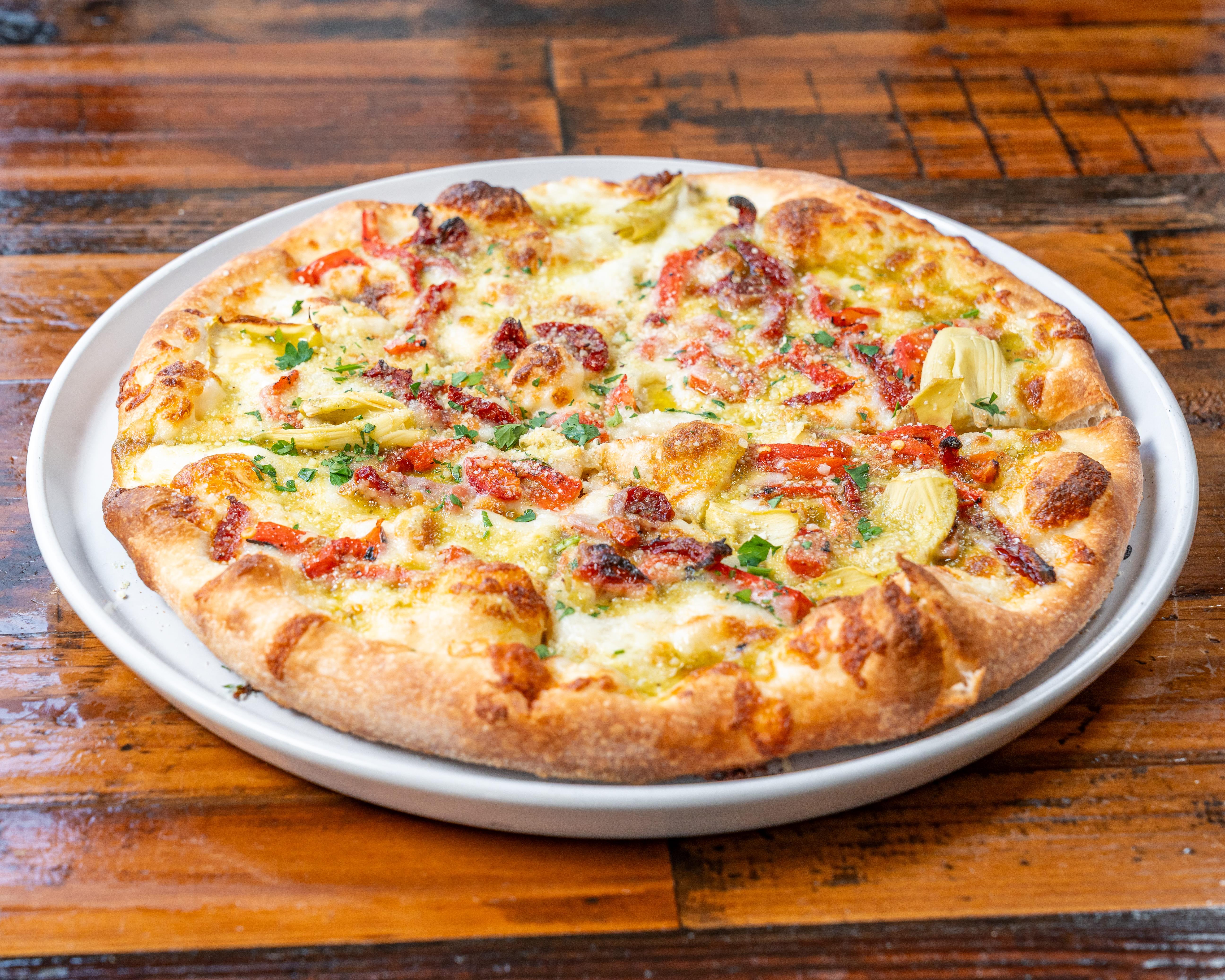 Roasted peppers, artichokes, sun-dried tomatoes, basil pesto, feta cheese, and mozzarella cheese