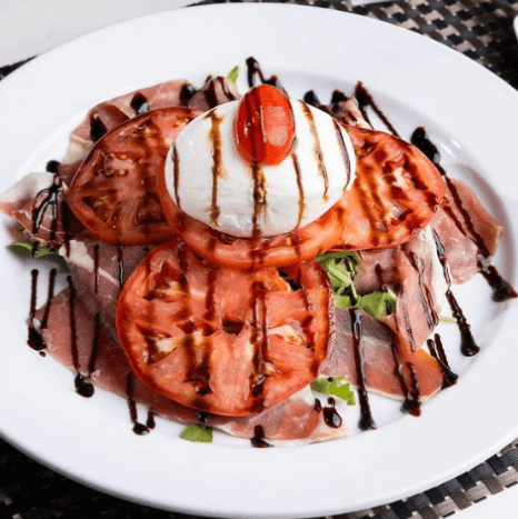 Creamy mozzarella, sliced tomatoes, arugula, sliced prosciutto, and balsamic reduction