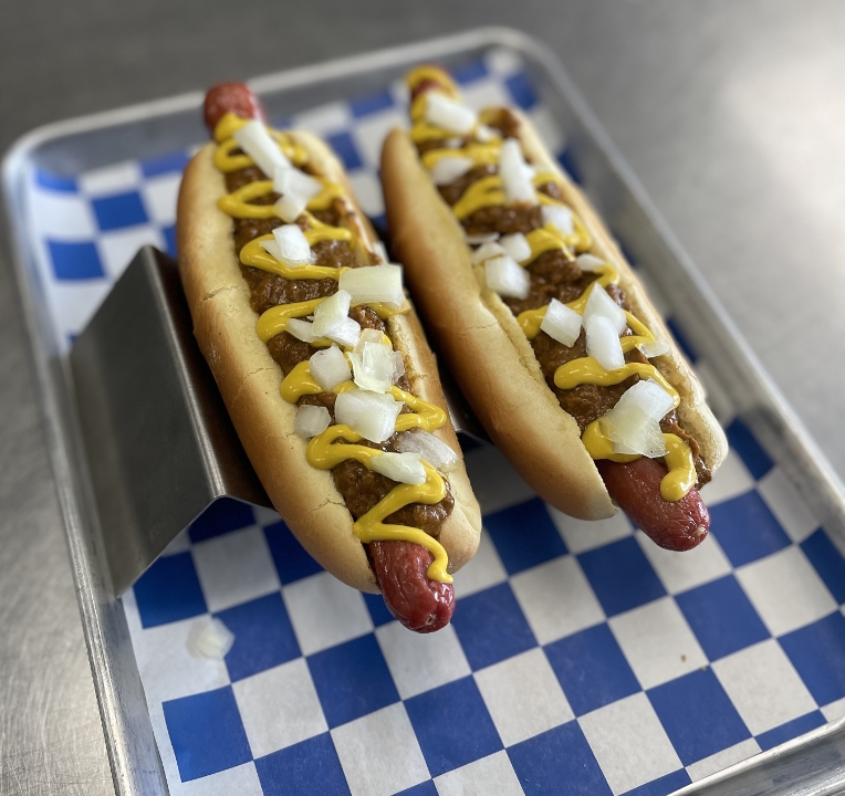 STEAMED BUN - NATURAL CASING HOT DOG - DETROIT STYLE CHILI - MUSTARD - WHITE ONIONS