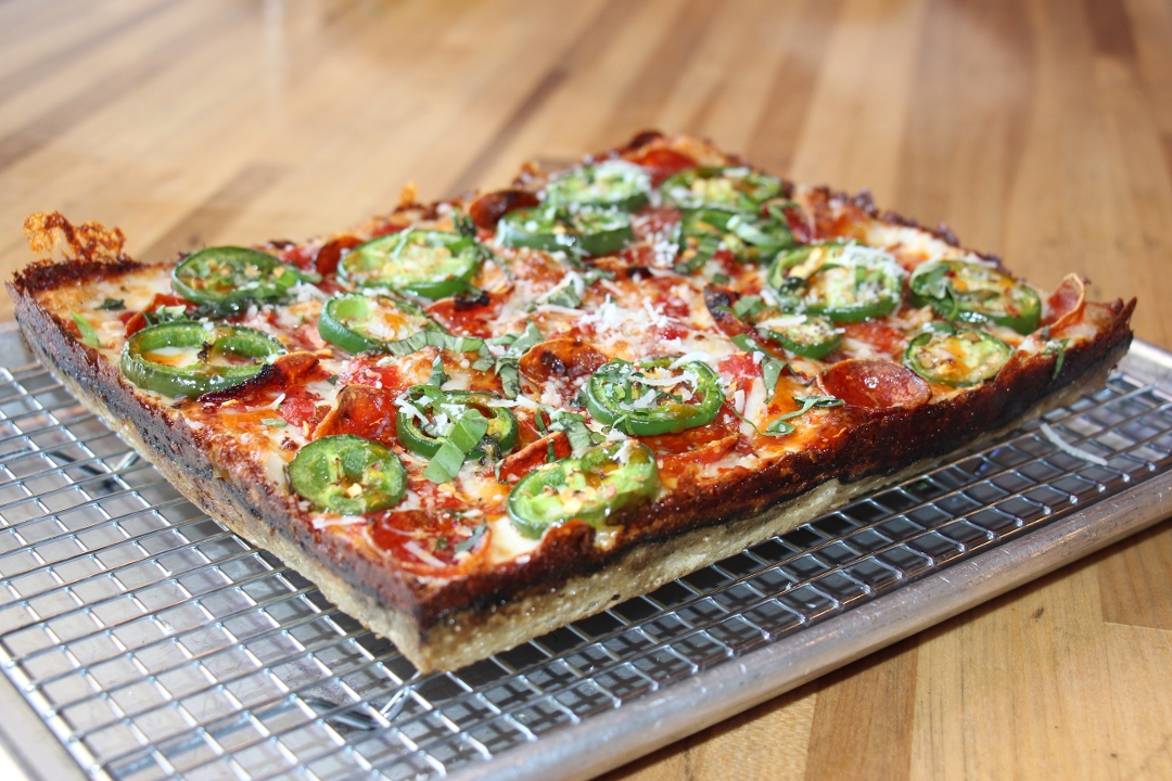 DETROIT RED SAUCE - BRICK CHEESE BLEND - EZZO CUP PEPPERONI - FRESH JALAPENO - HOT HONEY - CRUSHED RED PEPPER - PECORINO ROMANO - BASIL