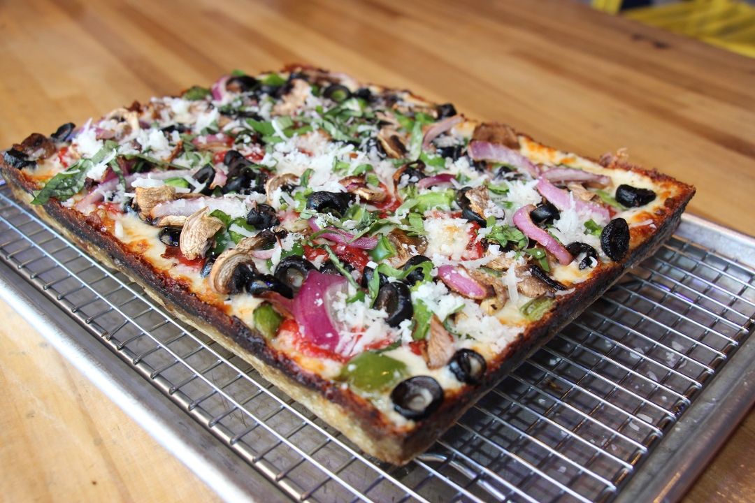 DETROIT RED SAUCE - BRICK CHEESE BLEND - GREEN PEPPER - BLACK OLIVES - MUSHROOMS - RED ONION - PECORINO ROMANO