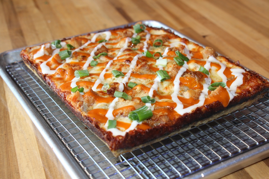 DETROIT RED SAUCE - BRICK CHEESE BLEND - DOUBLE EZZO CUP PEPPERONI - RANCH DRIZZLE - HOT HONEY DRIZZLE - PECORINO ROMANO – BASIL