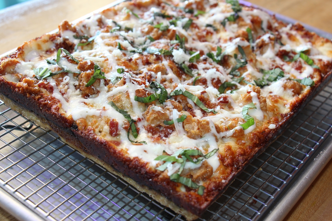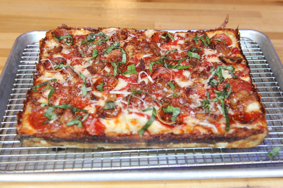 DETROIT RED SAUCE - SMOKED BACON - PINCHED SAUSAGE - EZZO CUP PEPPERONI - FRESH BASIL - PECORINO ROMANO