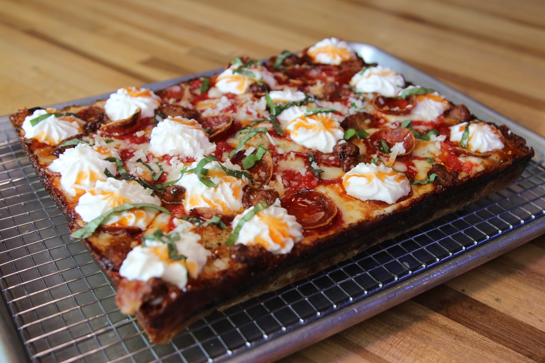 DETROIT RED SAUCE - BRICK CHEESE BLEND - WHIPPED RICOTTA - PINCHED SAUSAGE - EZZO CUP PEPPERONI - HOT HONEY - FRESH BASIL