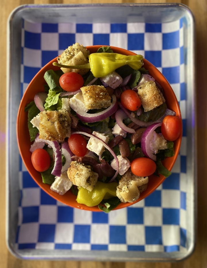 KALAMATA OLIVES - RED ONION - TOMATO - HOUSE MADE CROUTONS - PEPPERONCINI - FETA (FOR EXTRA DRESSING VISIT OUR DRESSING TAB)